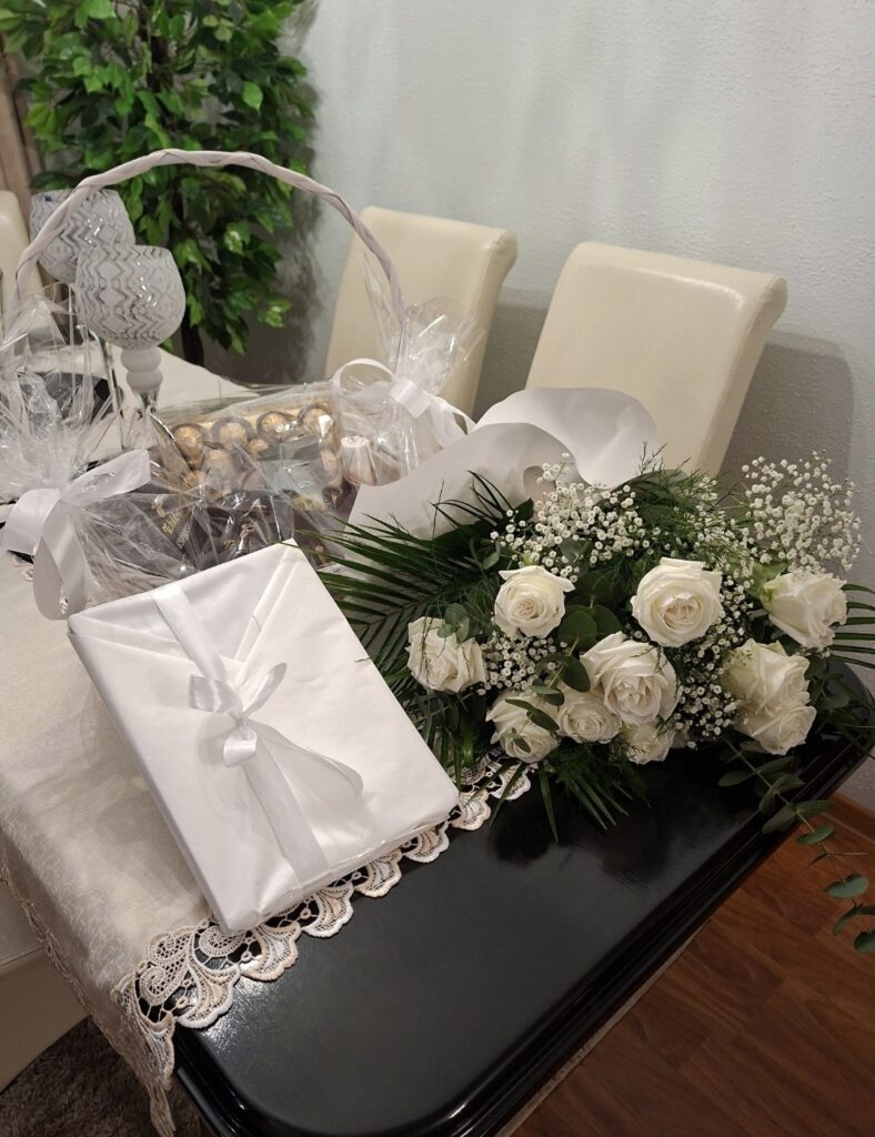 Nie zabrakło także kwiatów oraz koszyka z darami. W koszu znalazły się m.in. miód, czekolada, sok, kawa i herbata, produkty symbolizujące gościnność i serdeczność mieszkańców.