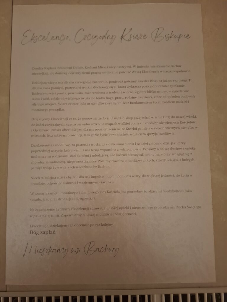 Choć Bachury są niewielką wsią, spotkanie z Biskupem pokazało, jak ważna jest lokalna wspólnota. Był to czas modlitwy, rozmów i zwykłego ludzkiego spotkania, chwila, w której mieszkańcy mogli być razem, porozmawiać z sąsiadami i wspólnie przeżyć wizytę pasterza Kościoła.