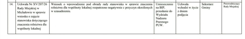 Oficjalne stanowisko urzędu jest jednoznaczne: na papierze proces „odmiejscowienia” Michałowa nie istnieje. Z perspektywy dziennikarskiej musimy jednak odnotować pewien dysonans. Zaledwie kilka dni temu, podczas XV Sesji Rady Miejskiej, radni w trybie pilnym przyjęli stanowisko dotyczące „znaczenia rolnictwa dla wspólnoty lokalnej” (punkt 6n).