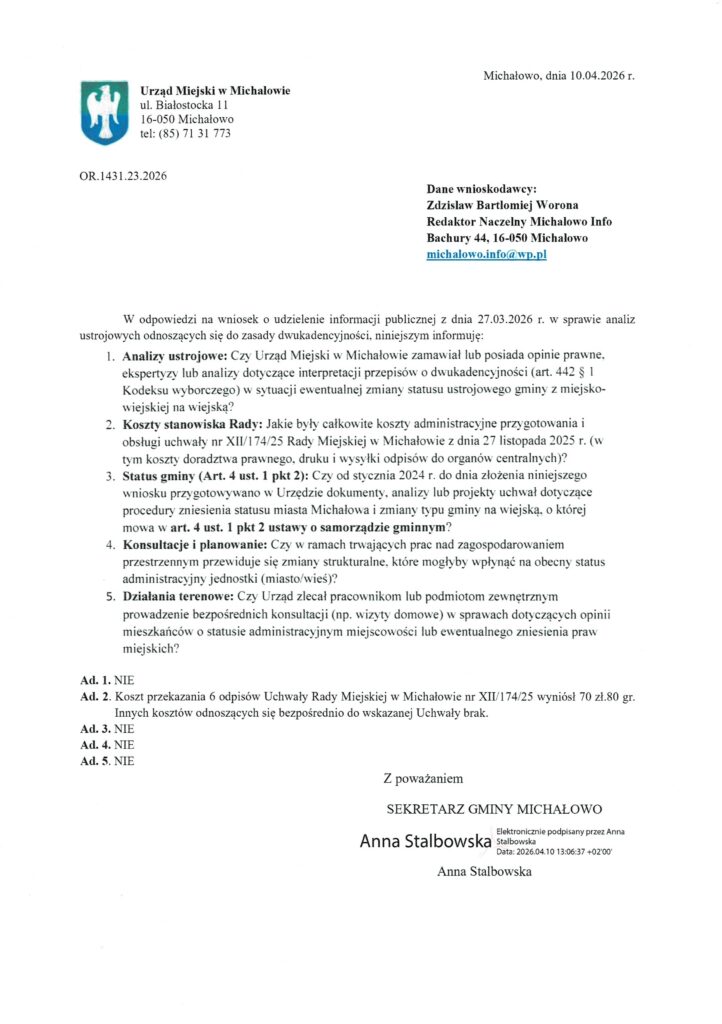 W związku z licznymi pytaniami mieszkańców oraz naszymi ustaleniami dotyczącymi ewentualnych zmian ustrojowych w Michałowie, redakcja Michałowo Info wystąpiła do Urzędu Miejskiego z wnioskiem o udostępnienie informacji publicznej. Otrzymaliśmy oficjalne odpowiedzi podpisane przez Sekretarz Gminy.